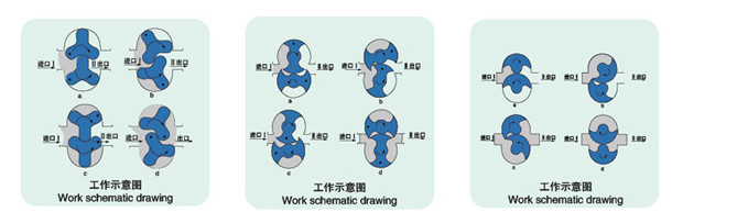 (2)二叶转子:适合于输送含有中小颗粒物料的介质,对中小颗粒物料的破碎率相对较低,略有脉动,容积量小于三叶转子。